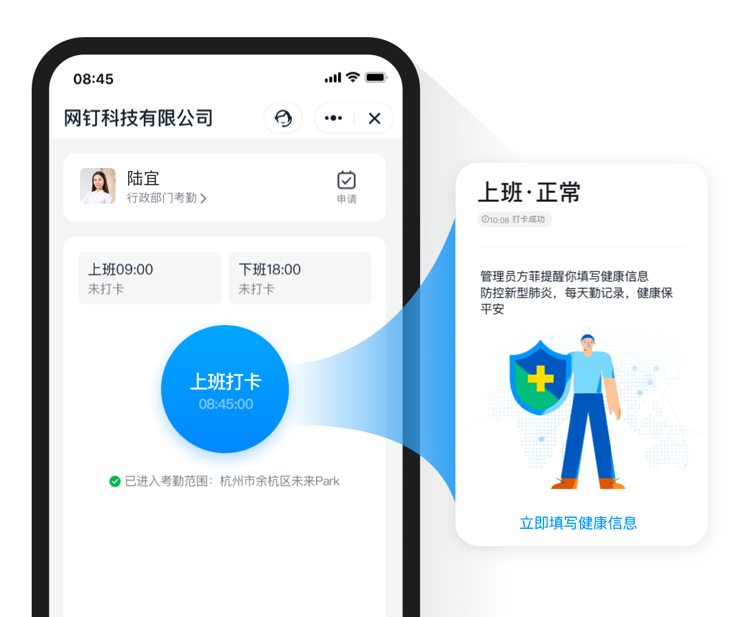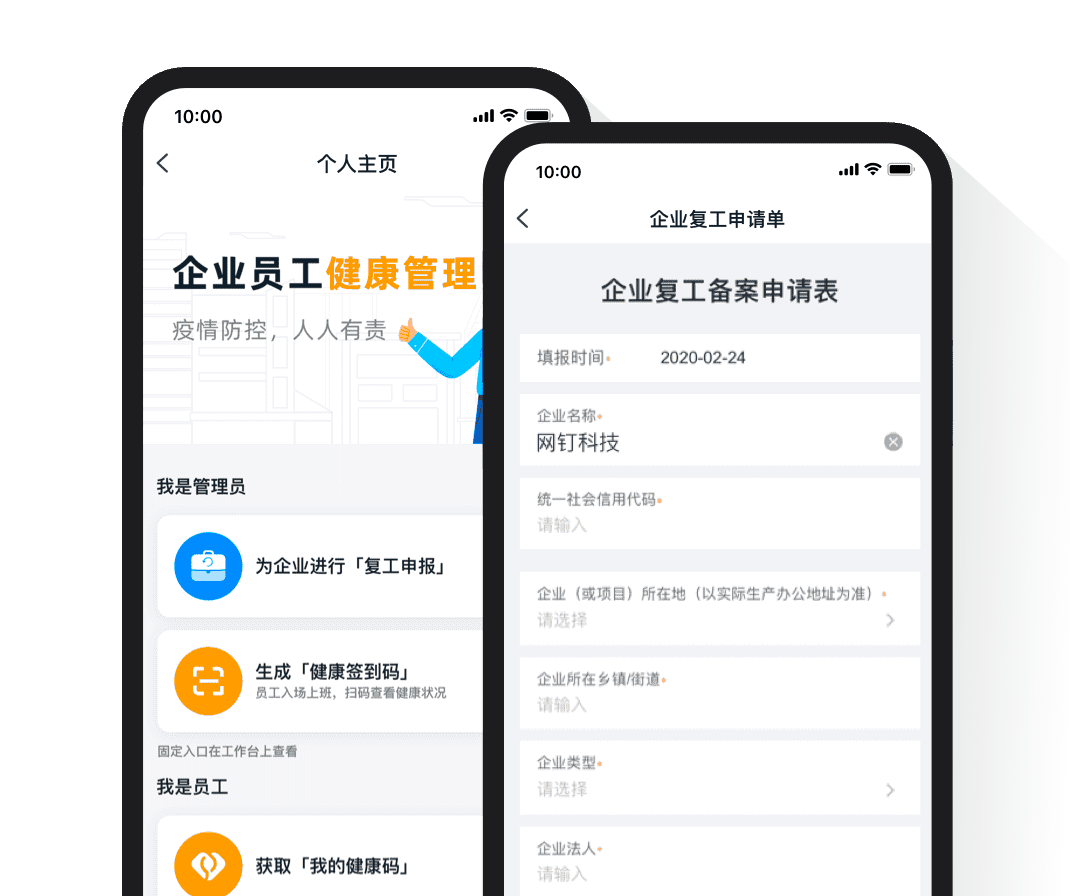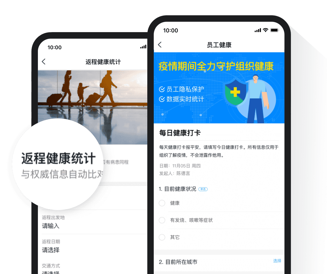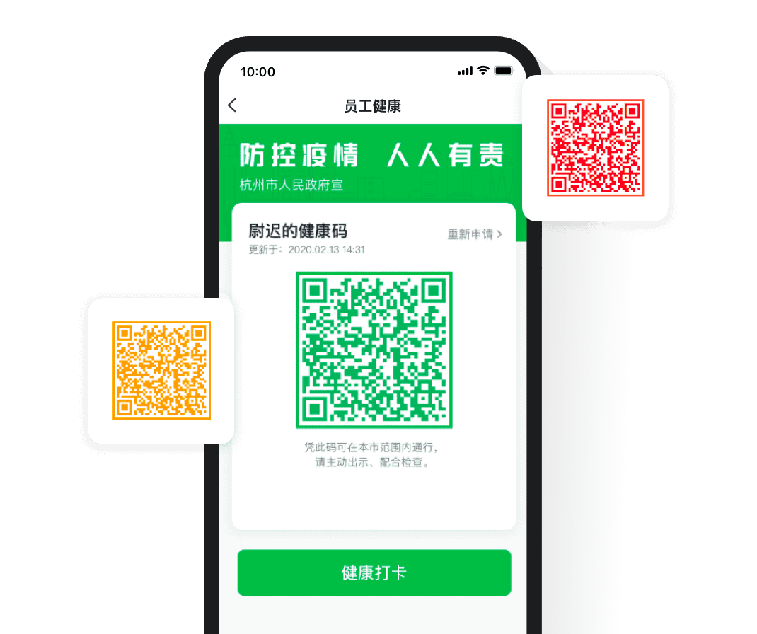企業(yè)復(fù)工防疫員工填報(bào)返程信息,上報(bào)健康情況,返崗后通過(guò)健康碼"亮碼"通行,并使用無(wú)接觸考勤,保障安全復(fù)工。